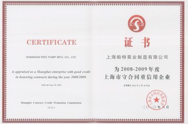 On Hai Pate Pump Manufacturing Co., Ltd. in 2008-2009 by the Shanghai Administration for Industry and Commerce [2008-2009 Shanghai Trustworthy business]; Shanghai Contract Credit Promotion Association awarded (AA class enterprise).