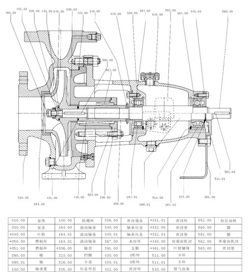 用戶可根據(jù)被輸送介質(zhì)的腐蝕性程度對(duì)泵的過(guò)流部分主要零件選用不同材質(zhì)。泵的過(guò)流部分主要零件的材料及其代號(hào)如下: