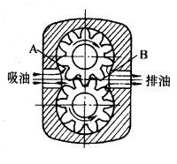 齒輪油泵的泵體中裝有一對(duì)回轉(zhuǎn)齒輪,一個(gè)主動(dòng),一個(gè)被動(dòng),依靠?jī)升X輪的相互嚙合,把泵內(nèi)的整個(gè)工作腔分兩個(gè)獨(dú)立的部分。A為吸入腔,B為排出腔。齒輪油泵在運(yùn)轉(zhuǎn)時(shí)主動(dòng)齒輪帶動(dòng)被動(dòng)齒輪旋轉(zhuǎn),當(dāng)齒輪從嚙合到脫開(kāi)時(shí)在吸入側(cè)就形成局部真空,液體被吸入。被吸入的液體充滿齒輪的各個(gè)齒谷而帶到排出側(cè),齒輪進(jìn)入嚙合時(shí)液體被擠出,形成高壓液體并經(jīng)泵排出口排出泵外。