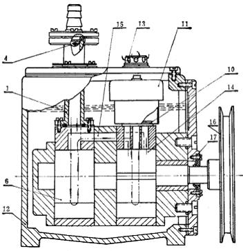 1.2X-1型旋片式真空泵:圖1是2X-1型雙級(jí)旋片式真空泵的剖面圖。氣體被抽除的路徑由圖中箭頭所示。排氣活門(閥片10)是用耐油橡膠板做成。為防止固體微粒落入泵內(nèi)損傷表面,特在進(jìn)氣管里裝有進(jìn)氣濾網(wǎng)(4)。在排氣閥上裝了油氣分離室(11),用它把被抽氣體所帶的油滴與氣體分離開(kāi),油流回箱里,氣體與部分油霧混合物排到大氣中去。整個(gè)泵體浸在油箱(12)中,淹沒(méi)泵的排氣閥,從而保證整個(gè)泵體密封。軸封(17)用的是耐油橡膠密封墊圈,用壓板在軸外固定。