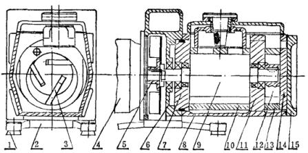 2.2XZ-8型高速直聯(lián)旋片泵:圖2是2XZ-8型泵結(jié)構(gòu)。它與原結(jié)構(gòu)的2X-8型比,抽速相同,但重量和體積都只有原泵的三分之一。