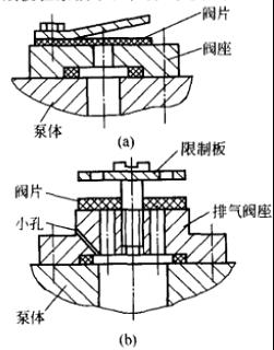 排氣閥是旋片泵主要易損件之一,將影響泵的抽氣性能并產(chǎn)生噪聲。排氣閥有兩種形式:一種是用橡膠墊做閥片,如圖1(a)所示;另一種是用布質(zhì)酚醛層壓板或彈簧鋼片做閥片,如圖1(b)所示.排氣閥必須浸在泵油中.在排氣過程中,壓縮氣體推開排氣閥片。穿過泵油后排出。泵油起到密封作用。
