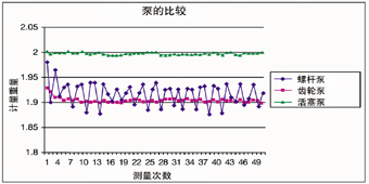圖1.三種類型的泵的比較。計量的物質(zhì)為多羥基化合物,密度大約1.6g/cm3,粘度大約為15,000mPas。
