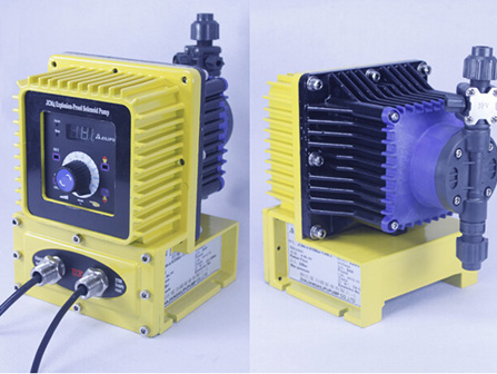 電機經(jīng)聯(lián)軸器帶動蝸桿并通過蝸輪減速使主軸和偏心輪作回轉運動,由偏心輪帶動挺桿在導筒內(nèi)作往復運動。連同柱塞,通過單向閥的作用使泵腔內(nèi)逐漸形成真空,吸入閥打開,吸入液體;當柱塞向前死點移動時,此時吸入閥關閉,排出閥打開,液體在膜片的推動下排出。在泵通過調(diào)節(jié)一定的行程的往復順還工作形成連續(xù)有壓力、定量的排放液體。
