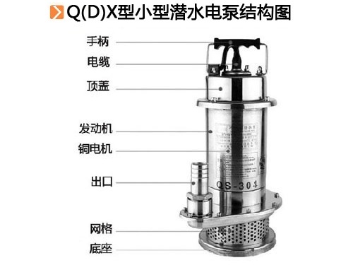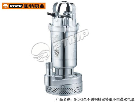 Q(D)X全不銹鋼精密鑄造小型潛水泵用途:適用于工礦企業(yè)、食品行業(yè)、海水養(yǎng)殖、景觀工程、深井提水、農(nóng)田灌溉等一般腐蝕性介質(zhì)